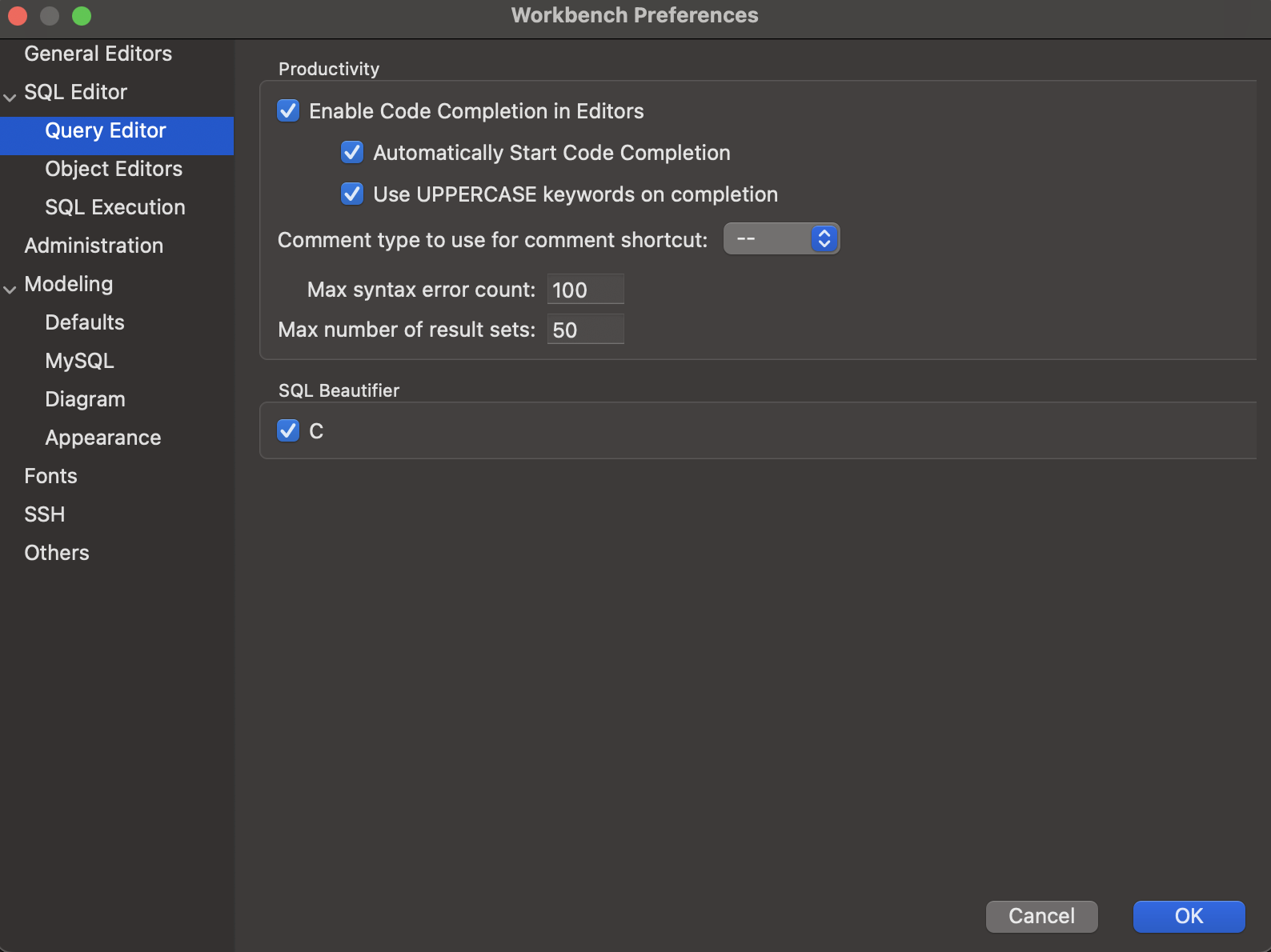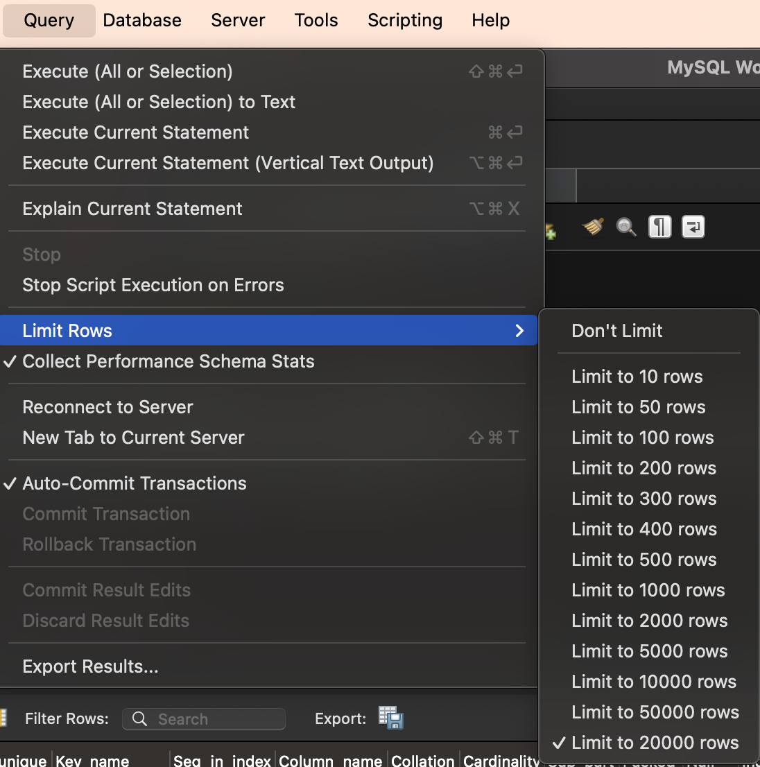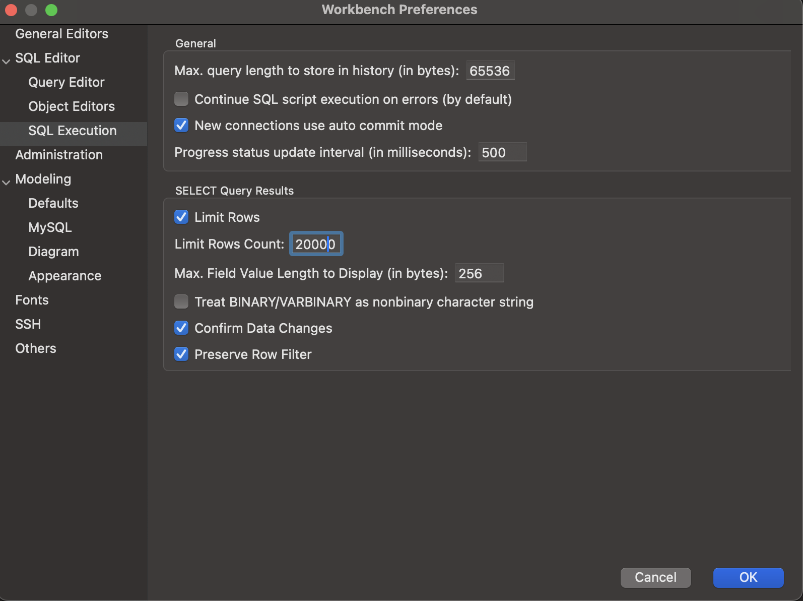 - Preferences의 "Limit Rows" 값을 0으로 설정하면 모든 데이터를 제한 없이 조회할 수 있습니다. 하지만 데이터가 많을 경우 Workbench가 느려지거나 멈출 수 있으니 주의하세요.